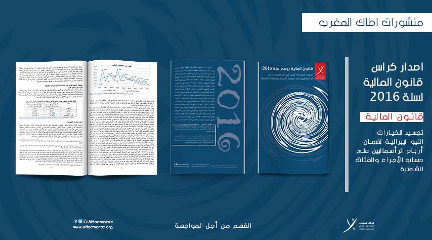 أصدرت اطاك المغرب كراسا يتضمن تحليلها لقانون مالية 2016، المرجو الاتصال بالمدموعات المحلية أو بالموقع الالكتروني للحصول على نسخة منه.
