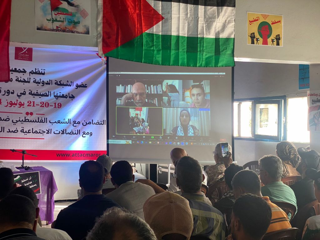 خصصت صبيحة اليوم الثاني من الجامعة الصيفية (20يوليوز 2024) لندوة عمومية بعنوان: “التضامن مع الشعب الفلسطيني ضد حرب الإبادة الصهيونية المدعومة من الإمبريالية”. وشارك فيها كل من: عامر أبو نضال، سكرتير عام الشبكة العالمية لدعم القضية الفلسطينية؛ ومحمد الغفري، المنسق الوطني للجبهة المغربية لدعم فلسطين ومناهضة التطبيع؛ وكل من سيون أسيدون، وسمية بوعبد الله وسلمى أوعمرو عن حركة المقاطعة وسحب الاستثمارات وفرض العقوبات بالمغرب (BDS Maroc).