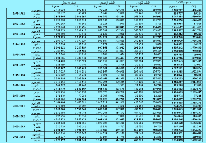 ضمن هذه الحدود أتى السعي نحو تعميم التعليم (الابتدائي والإعدادي)، بالرفع من أعداد الوالجين إياه كما يعبر الجدول أسفله.