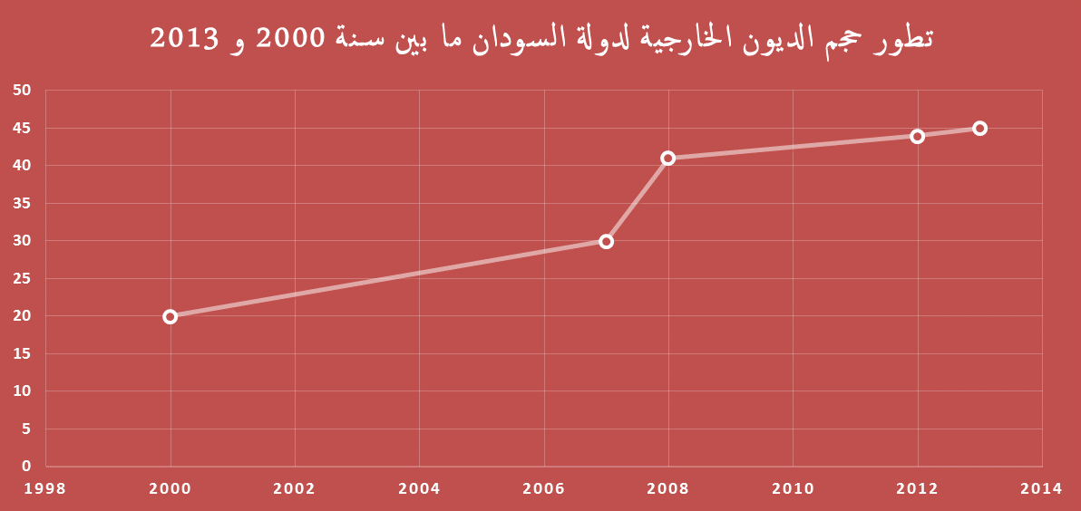 تبلغ قيمة أصل الدين حوالي 12 مليار دولار، وارتفعت مديونية السودان الخارجية بنسب كبيرة جدا فاقت كل التوقعات، حيث قفزت خدمة الدين (حصة الدين الأصلي + الفوائد) من 20 مليار دولار سنة 2000 إلى 30 مليار دولار سنة 2007، لتصل إلى 41.4 مليار دولار سنة 2011 أي حوالي 64.8% من الناتج الداخلي الخام، إلى أن بلغت 43.7 مليار دولار سنة 2012 ثم انتقلت خدمة الدين في مجملها إلى 45 مليار دولار في 2013 أي 96.7 % من الناتج الداخلي الخام حسب صندوق النقد الدولي.