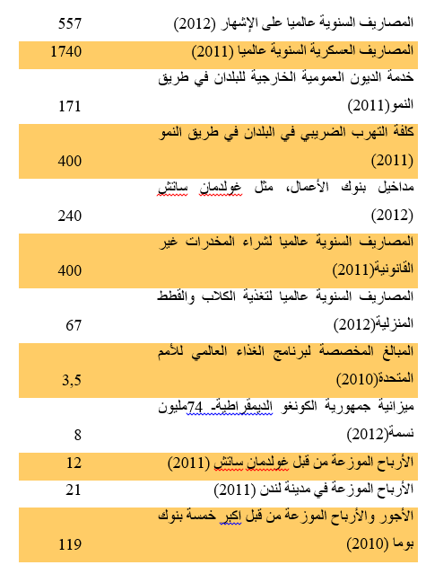يبين الجدول أسفله بعض الأمثلة من ميزانيات، حسب أبواب متعددة وعلى صعيد عالمي – المصاريف الفعلية وخسائر- مع أن الحاجات الأساسية لقسم من الساكنة لا يتم تلبيتها. فعلى سبيل المثال، يتم الإنفاق على توجيه السكان لما يتوجب شراؤه ( نفقات الإشهار) 159 مرة أكثر من المبلغ المخصص لبرنامج الغذاء العالمي لمنظمة الامم المتحدة لأجل القضاء على الجوع في العالم.