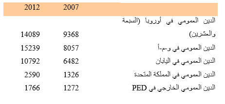 جدول 1 :الدين العمومي في البلدان المتقدمة والبلدان في طريق النمو بين 2007و 2012 ( بملايير الدولارات الأمريكية)[1]