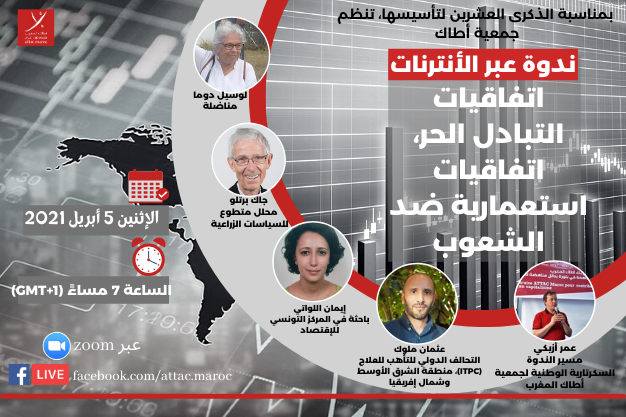 هكذا إذن تشكل مسألة اتفاقيات “التبادل الحر” مسألة حاسمة بالنسبة لمستقبل المغرب وشروط عيش المغاربة. وقامت جمعية أطاك المغرب بعمل تثقيف شعبي مكثف للتنديد باتفاقيات “التبادل الحر”، واقتراح آفاق للنضال، وتقوية أواصر التضامن بين شعوب الشمال والجنوب، وبين مختلف الائتلافات المناهضة لهذه الاتفاقيات على مستوى المغرب. كما توليها أهمية كبيرة، أولا، من أجل رفع الصمت المحيط بهذه المسألة، ثم لعرض عناصر التفكير والبدائل حولها، وتعزيز مبادرات التوعية والأنشطة المشتركة ضدها. ومن هنا تنظيم هذه الندوة الالكترونية يوم 5 أبريل 2021 التي ستكون على تطبيق زووم، وستبت أيضا على صفحة فيسبوك أطاك المغرب من هنا . أنظر البرنامج والمشاركين/ات أسفله. وسنوفر الترجمة الفورية من الفرنسية الى العربية والعكس أيضا.