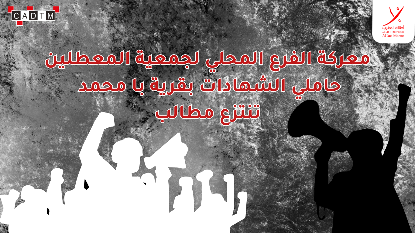 اننا في جمعية أطاك المغرب، واذ ندين جميع أشكال التضييق والقمع الذي تعرض لها مناضلو/ات فرع الجمعية المعطلين حاملي الشهادات بقرية با محمد، ونهنئ رفاقنا المضربين على انتصار معركتهم، فإننا نؤكد على مطالبتنا بــ: