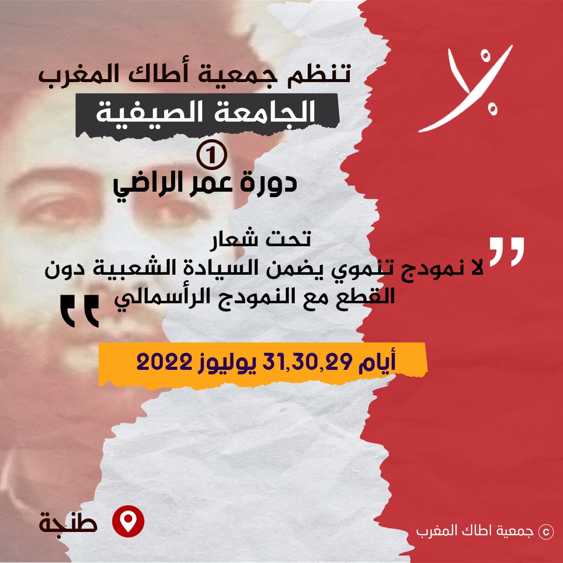 نظمت جمعية أطاك المغرب عضو الشبكة الدولية للجنة من أجل الغاء الديون غير الشرعية، أيام 29 و 30 و 31 يوليوز 2022الجامعة الصيفية الأولى “دورة عمر الراضي” تحت شعار: “لا نموذج تنموي يضمن السيادة الشعبية دون القطع مع النموذج الرأسمالي” بتاريخ 29/30/31 يوليوز 2022 بمدينة طنجة.