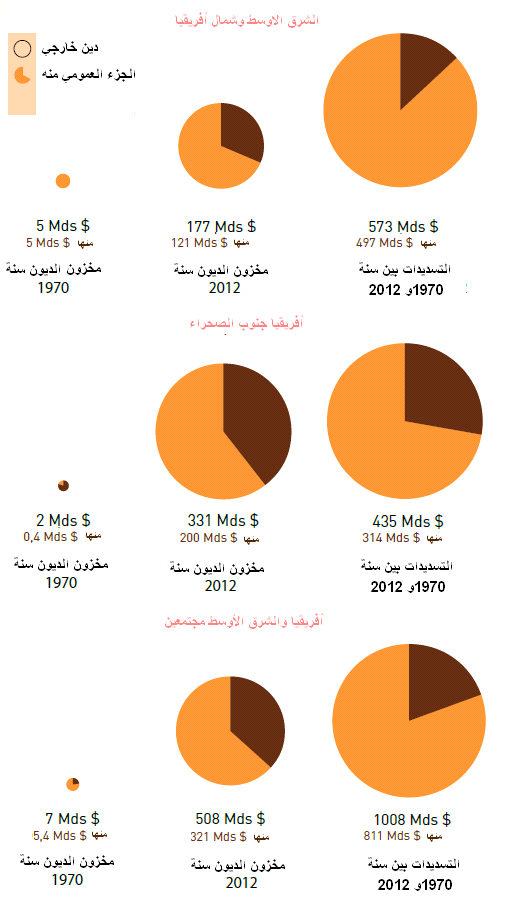 بالنسبة لدول افريقيا الشمالية و افريقيا جنوب الصحراء و الشرق الأوسط، فإن مبالغ الدين الخارجي الاجمالية قد تضاعفت 73 مرة ما بين 1973 و 2012 . وخلال هذه المرحلة فقد سددت 145 مرة المقدار الاصلي المستحق خلال 1970 .