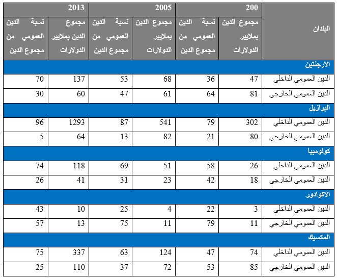 جدول-1- مقارنة الدين العمومي( بملايير الدولارات الأمريكية و ب℅ من مجموع الدين) بأمريكا اللاتينية ما بين 2000 و 2013[12]